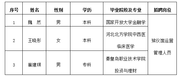 因公司發(fā)展需要,承德市國瑞置業(yè)有限公司委托第三方機構(gòu)面向社會公開招聘殯儀館運營管理人員3名。現(xiàn)對擬錄用人員信息進行公示,公示期間如有異議,可通過電話、信函等方式反映,反映意見請署真實姓名。