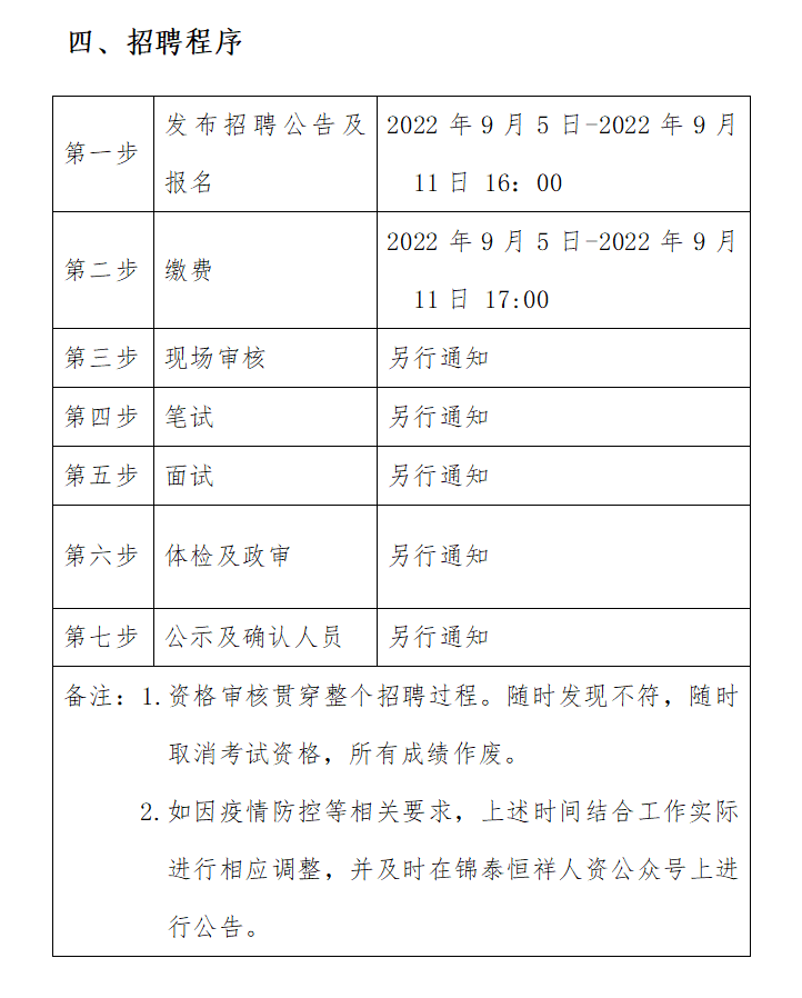 ?2022年9月5日-2022年9月11日16:00 在錦泰恒祥人資官網(wǎng)(www.jthxhr.com)、“錦泰恒祥人力資源服務(wù)有限公司”微信公眾號、“國控集團”官方網(wǎng)站(www.xieekai.com)及上級部門要求的相關(guān)網(wǎng)站等發(fā)布招聘公告。