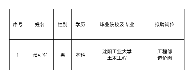 因公司發(fā)展需要,承德市國越房地產(chǎn)開發(fā)有限公司委托第三方機(jī)構(gòu)面向社會公開工程部造價崗員工1名。現(xiàn)對擬錄用人員信息進(jìn)行公示,公示期間如有異議,可通過電話、信函等方式反映,反映意見請署真實姓名。
