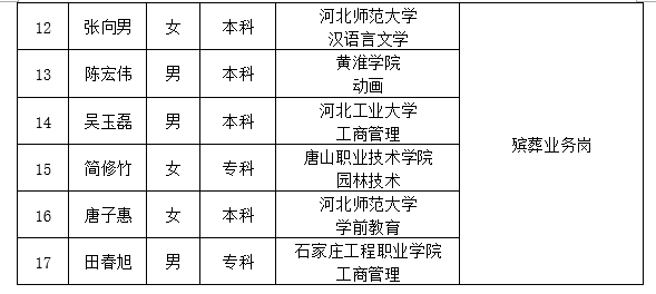 因公司發(fā)展需要,承德市國瑞置業(yè)有限公司委托第三方機構(gòu)面向社會公開招聘殯儀館運營各崗位人員17名。現(xiàn)對擬錄用人員信息進行公示,公示期間如有異議,可通過電話、信函等方式反映,反映意見請署真實姓名。