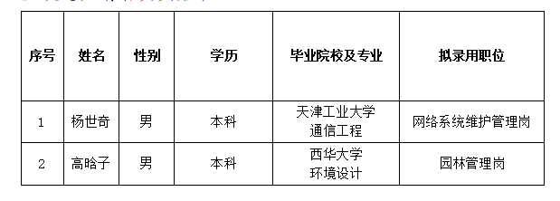 根據(jù)2023年度承德市國瑞置業(yè)有限責(zé)任公司公開招聘工作人員的相關(guān)要求,經(jīng)過筆試、面試、體檢和考察等程序,確定楊世奇、高晗子2名同志為承德市國瑞置業(yè)有限責(zé)任公司擬錄用工作人員,現(xiàn)予以公示。現(xiàn)對(duì)擬錄用人員信息進(jìn)行公示,公示期間如有異議,可通過電話、信函等方式反映,反映意見請(qǐng)署真實(shí)姓名。